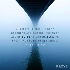 Understand this, my dear brothers and sisters: You must all be quick to listen, slow to speak, and slow to get angry. James 1:19 NLT