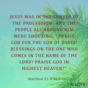 Jesus was in the center of the procession, and the people all around him were shouting, "Praise God for the Son of David! Blessings on the one who comes in the name of the LORD! Praise God in highest heaven!"