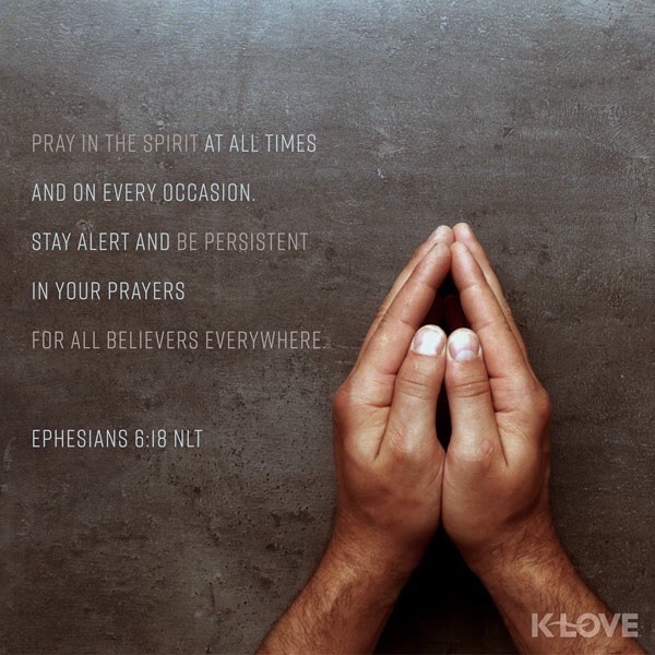 Pray in the Spirit at all times and on every occasion. Stay alert and be persistent in your prayers for all believers everywhere.