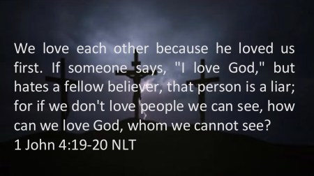 We love each other because he loved us first. If someone says, "I love God," but hates a fellow believer, that person is a liar; for if we don’t love people we can see, how can we love God, whom we cannot see?
