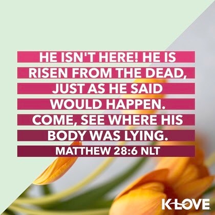 "Don’t be afraid! I know you are looking for Jesus, who was crucified. He isn’t here! He is risen from the dead, just as he said would happen." (Matthew 28:5-6, NLT)