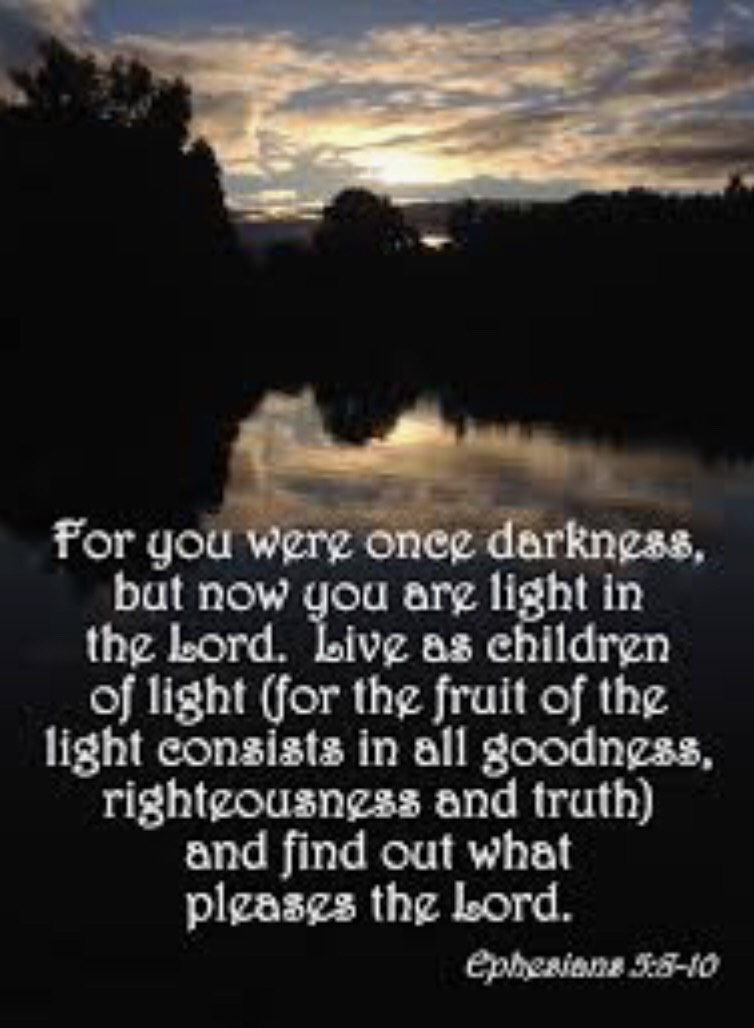 For you were once darkness, but now you are light in the Lord. Live as children of light (for the fruit of the light consists in all goodness, righteousness and truth) and find out what pleases the Lord.