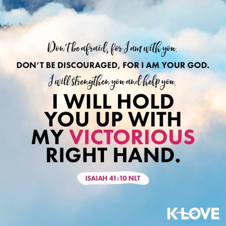 Don’t be afraid, for I am with you. Don’t be discouraged, for I am your God. I will strengthen you and help you. I will hold you up with my victorious right hand.