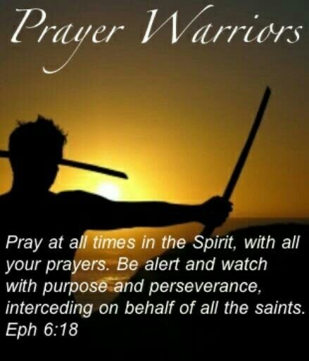 Prayer Warriors – And pray in the Spirit on all occasions with all kinds of prayers and requests. With this in mind, be alert and always keep on praying for all the Lord’s people. Ephesians 6:18 NIV