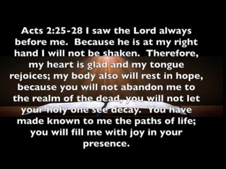 For David says of him: I saw the Lord ever before me, with him at my right hand I shall not be disturbed. Therefore my heart has been glad and my tongue has exulted; my flesh, too, will dwell in hope, because you will not abandon my soul to the netherworld, nor will you suffer your holy one to see corruption. You have made known to me the paths of life; you will fill me with joy in your presence.