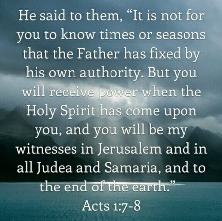 He answered them, “It is not for you to know the times or seasons that the Father has established by his own authority. But you will receive power when the Holy Spirit comes upon you, and you will be my witnesses in Jerusalem, throughout Judea and Samaria, and to the ends of the earth.”