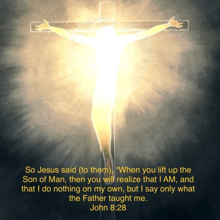 So Jesus said (to them), “When you lift up the Son of Man, then you will realize that I AM, and that I do nothing on my own, but I say only what the Father taught me.