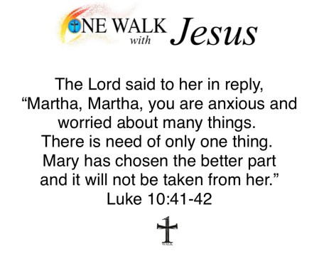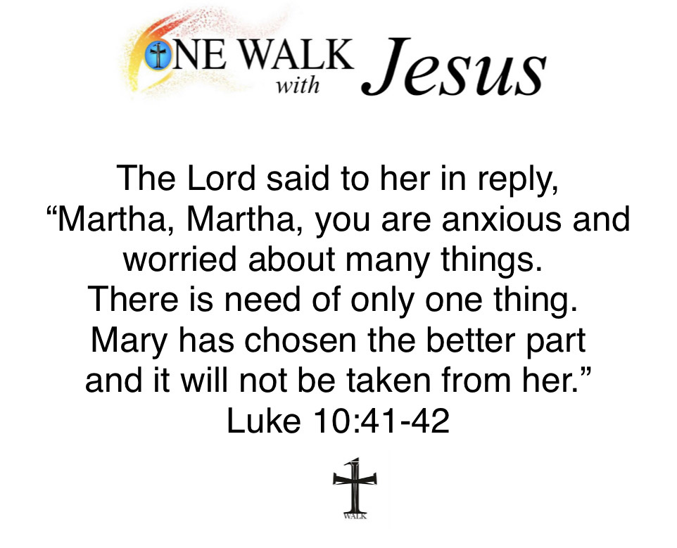 In today’s Gospel, St. Luke teaches us about prayer. In the story of Martha and Mary, Jesus reminds us that there is only one thing that is needful: contemplating him. Instead of focusing on many things, spend time focusing on Jesus in simple prayer.