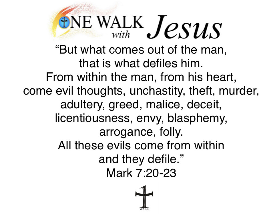 Jesus summoned the crowd again and said to them, “Hear me, all of you, and understand. Nothing that enters one from outside can defile that person; but the things that come out from within are what defile.” When he got home away from the crowd his disciples questioned him about the parable. He said to them, “Are even you likewise without understanding? Do you not realize that everything that goes into a person from outside cannot defile, since it enters not the heart but the stomach and passes out into the latrine?” (Thus he declared all foods clean.) “But what comes out of the man, that is what defiles him. From within the man, from his heart, come evil thoughts, unchastity, theft, murder, adultery, greed, malice, deceit, licentiousness, envy, blasphemy, arrogance, folly. All these evils come from within and they defile.”