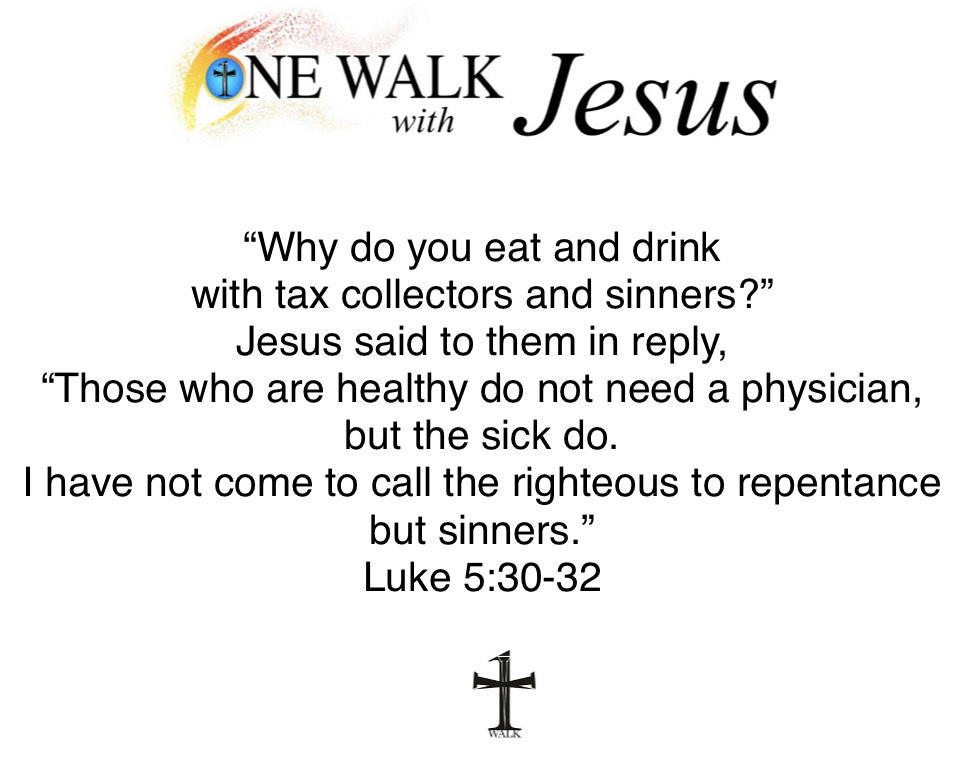 Jesus saw a tax collector named Levi sitting at the customs post. He said to him, “Follow me.” And leaving everything behind, he got up and followed him. Then Levi gave a great banquet for him in his house, and a large crowd of tax collectors and others were at table with them. The Pharisees and their scribes complained to his disciples, saying, “Why do you eat and drink with tax collectors and sinners?” Jesus said to them in reply, “Those who are healthy do not need a physician, but the sick do. I have not come to call the righteous to repentance but sinners.”