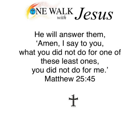 Jesus said to his disciples: “When the Son of Man comes in his glory, and all the angels with him, he will sit upon his glorious throne, and all the nations will be assembled before him. And he will separate them one from another, as a shepherd separates the sheep from the goats. He will place the sheep on his right and the goats on his left. Then the king will say to those on his right, ‘Come, you who are blessed by my Father. Inherit the kingdom prepared for you from the foundation of the world. For I was hungry and you gave me food, I was thirsty and you gave me drink, a stranger and you welcomed me, naked and you clothed me, ill and you cared for me, in prison and you visited me.’ Then the righteous will answer him and say, ‘Lord, when did we see you hungry and feed you, or thirsty and give you drink? When did we see you a stranger and welcome you, or naked and clothe you? When did we see you ill or in prison, and visit you?’ And the king will say to them in reply, ‘Amen, I say to you, whatever you did for one of these least brothers of mine, you did for me.’ Then he will say to those on his left, ‘Depart from me, you accursed, into the eternal fire prepared for the Devil and his angels. For I was hungry and you gave me no food, I was thirsty and you gave me no drink, a stranger and you gave me no welcome, naked and you gave me no clothing, ill and in prison, and you did not care for me.’ Then they will answer and say, ‘Lord, when did we see you hungry or thirsty or a stranger or naked or ill or in prison, and not minister to your needs?’ He will answer them, ‘Amen, I say to you, what you did not do for one of these least ones, you did not do for me.’ And these will go off to eternal punishment, but the righteous to eternal life.”