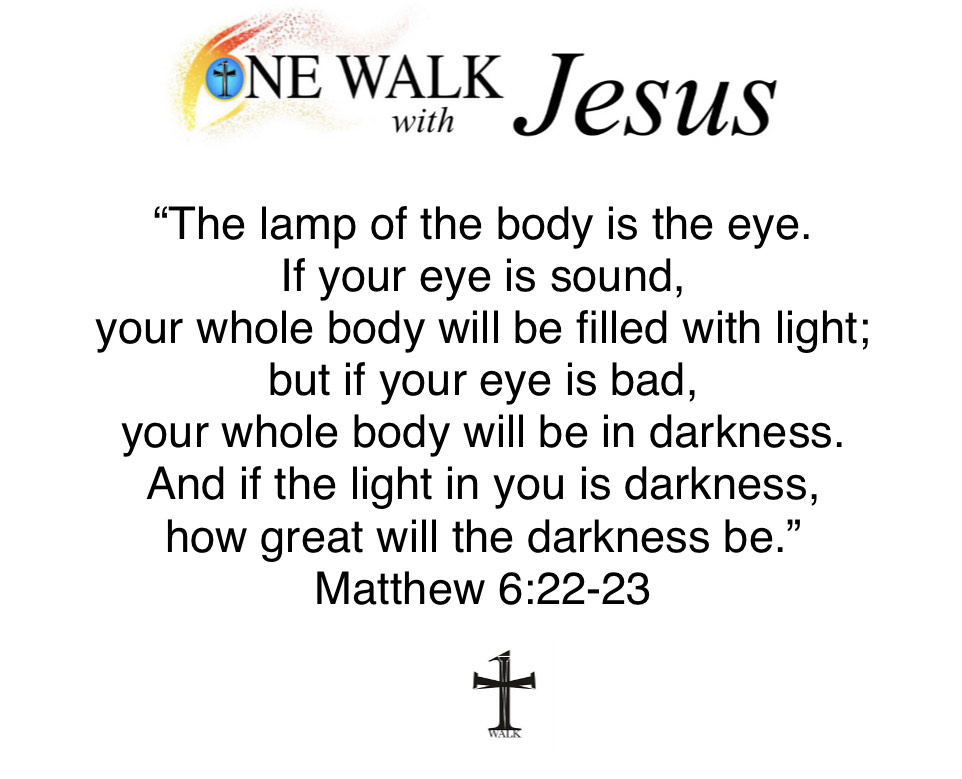 Jesus said to his disciples: “Do not store up for yourselves treasures on earth, where moth and decay destroy, and thieves break in and steal. But store up treasures in heaven, where neither moth nor decay destroys, nor thieves break in and steal. For where your treasure is, there also will your heart be. “The lamp of the body is the eye. If your eye is sound, your whole body will be filled with light; but if your eye is bad, your whole body will be in darkness. And if the light in you is darkness, how great will the darkness be.”