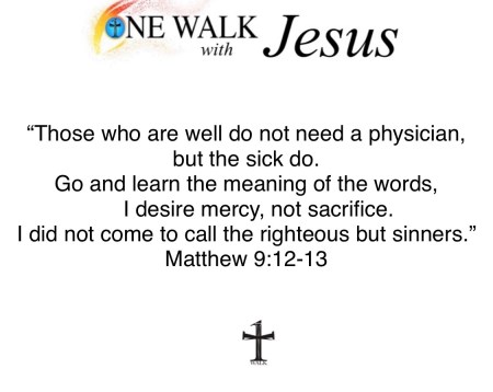 As Jesus passed by, he saw a man named Matthew sitting at the customs post. He said to him, “Follow me.” And he got up and followed him. While he was at table in his house, many tax collectors and sinners came and sat with Jesus and his disciples. The Pharisees saw this and said to his disciples, “Why does your teacher eat with tax collectors and sinners?” He heard this and said, “Those who are well do not need a physician, but the sick do. Go and learn the meaning of the words, I desire mercy, not sacrifice. I did not come to call the righteous but sinners.”