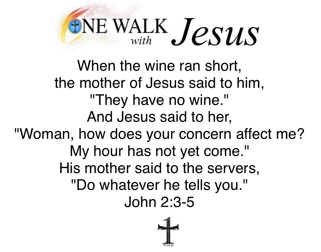 There was a wedding at Cana in Galilee, and the mother of Jesus was there. Jesus and his disciples were also invited to the wedding. When the wine ran short, the mother of Jesus said to him, "They have no wine." And Jesus said to her, "Woman, how does your concern affect me? My hour has not yet come." His mother said to the servers, "Do whatever he tells you." Now there were six stone water jars there for Jewish ceremonial washings, each holding twenty to thirty gallons. Jesus told them, "Fill the jars with water." So they filled them to the brim. Then he told them, "Draw some out now and take it to the headwaiter." So they took it. And when the headwaiter tasted the water that had become wine, without knowing where it came from (although the servers who had drawn the water knew), the headwaiter called the bridegroom and said to him, "Everyone serves good wine first, and then when people have drunk freely, an inferior one; but you have kept the good wine until now." Jesus did this as the beginning of his signs at Cana in Galilee and so revealed his glory, and his disciples began to believe in him.