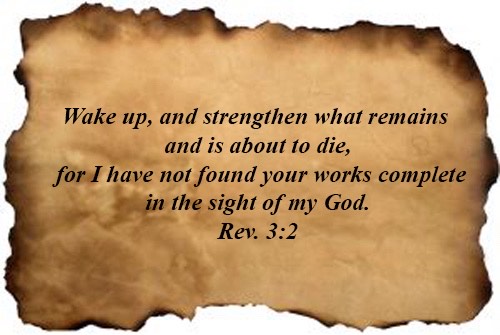 Wake up then, and strengthen what remains that was about to die, because I have not found your deeds complete in the sight of my God.